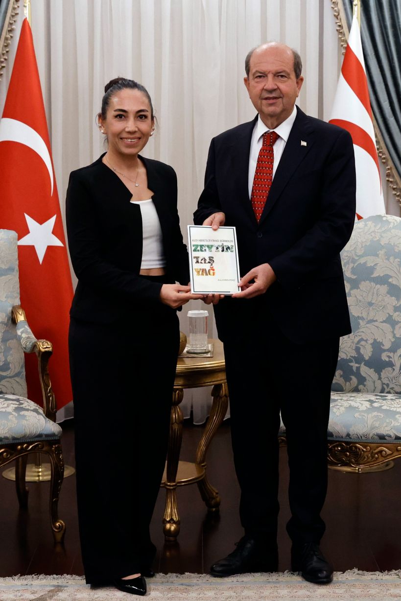 Toplantının sonunda, Cumhurbaşkanı Tatar’a “Kuzey Kıbrıs’ta Zeytinyağı Değirmenleri” adlı kitap hediye edildi. Ayrıca Cumhurbaşkanlığı Daire Müdürü Osman Bora Çağakan da toplantıda yer aldı.