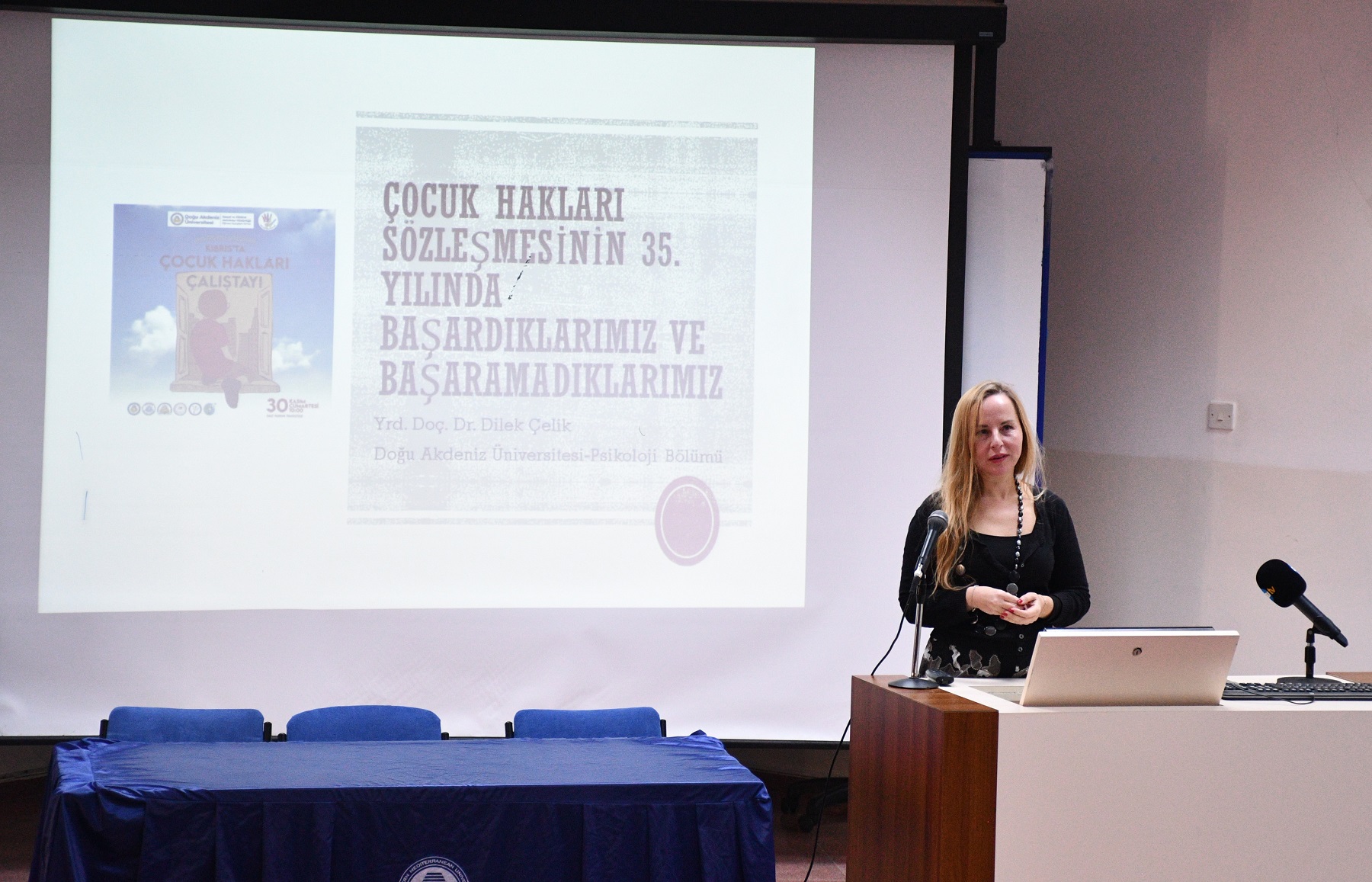 Açılış konuşmalarının ardından düzenlenen panelde, DAÜ Fen ve Edebiyat Fakültesi Psikoloji Bölümü Bölüm Başkan Yardımcısı Yrd. Doç. Dr. Dilek Çelik, “Çocuk Hakları Sözleşmesi’nin 35. Yılında Başarılar ve Eksiklikler” başlıklı bir sunum yaptı. DAÜ Eğitim Fakültesi Öğretim Üyesi Doç. Dr. Eda Yazgın ise “Okullarda Risk Altındaki Çocuklara Yönelik Psikoeğitimsel Müdahaleler” konusunda bilgiler aktardı. Panelin diğer konuşmacısı, Evrensel Çocuk Hakları Derneği Başkanı Laden Asilzade ise “KKTC’de Çocuk Hakları Aktivizmi ve Savunuculuk” üzerine görüşlerini paylaştı.