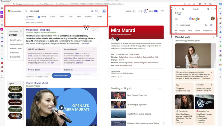 In Edge, you can search in two engines simultaneously: if Bing is your default and you click on the Search icon, you'll see, say, Google results (and vice versa). It will stay in sync and refresh with the new query. Have you ever tried it? Is this useful? Asking for a friend 🙂 pic.twitter.com/p016dF8Wc1— Mikhail Parakhin (@MParakhin) January 13, 2024